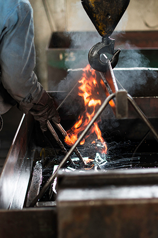 Toutes les pièces d’efforts, à peine sorties du four, sont refroidies rapidement dans un bain puis recuites. Quand la première opération assure la résistance, la seconde garantit l’élasticité. Soumises à des contraintes importantes, nos pièces se déforment mais ne cassent pas.