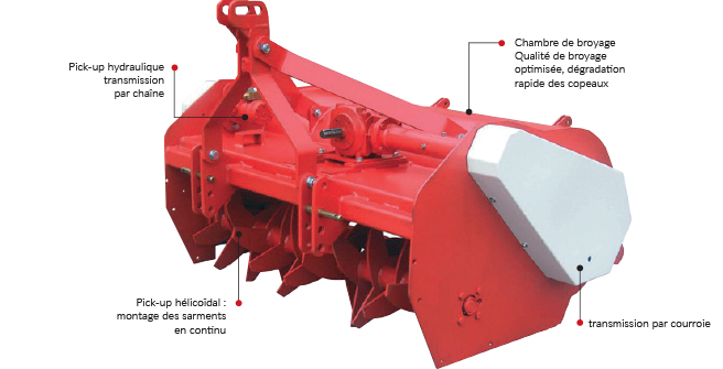 Le broyage des sarments se fait en continue quelques soient les conditions d’utilisation. Aspirés régulièrement, les sarments sont broyés finement.