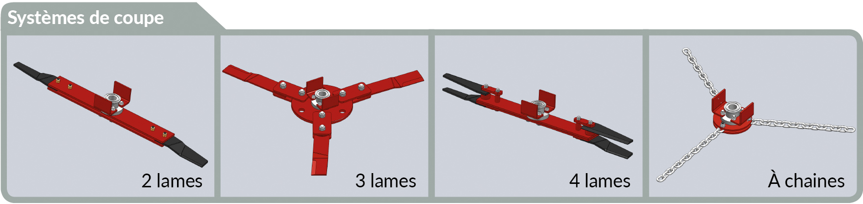 Les Gyrobroyeurs sont disponibles en 12 modèles avec dix largeurs de coupe différentes (de 90 cm à 3 m). et répartis en quatre gammes : loisir, agricole, vigne et forestières.