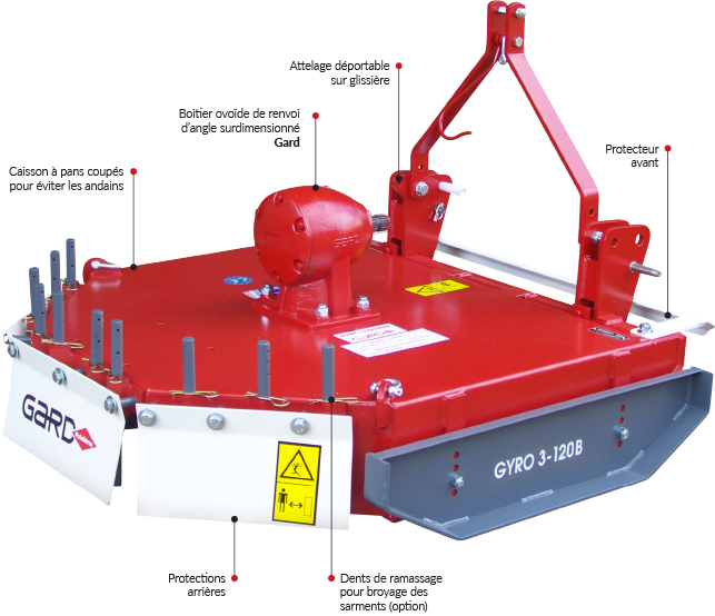 Le Gyrobroyeur, marque déposée par les établissements Gard, est la référence pour broyer herbes et sarments et pour défricher une parcelle. Tout-terrain du broyage, il s’adapte à tous les types de sols qu’ils soient caillouteux ou irréguliers.