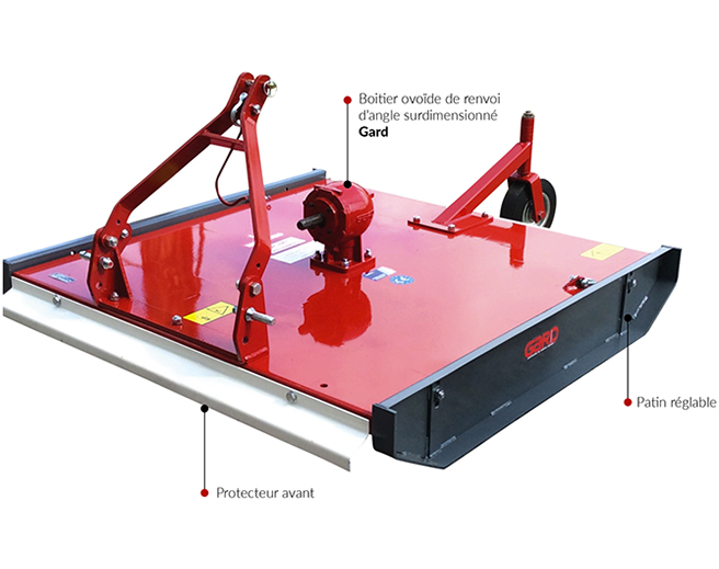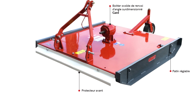 Véritable marque de fabrique de la société Gard, le boitier ovoide de renvoi de d’angle est surdimensionné en puissance. Les Gyrobrobroyeurs sont vaillants dans les situations difficiles et offrent un confort d’utilisation inégalé en situation standard.