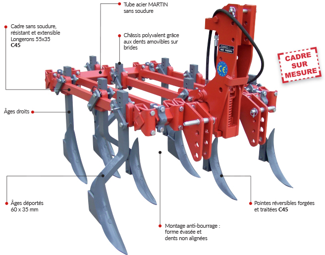 Le travail des pièces stratégiques à la forge, permet de proposer des galbes incomparables. Tous les angles sont étudiés pour offrir une pénétration facilitée des dents dans le sol. Le galbe des âges, la géométrie du châssis et la distribution des dents permettent de répondre à tous besoins de déplacement de terre, sans bourrage ni semelle de labour.